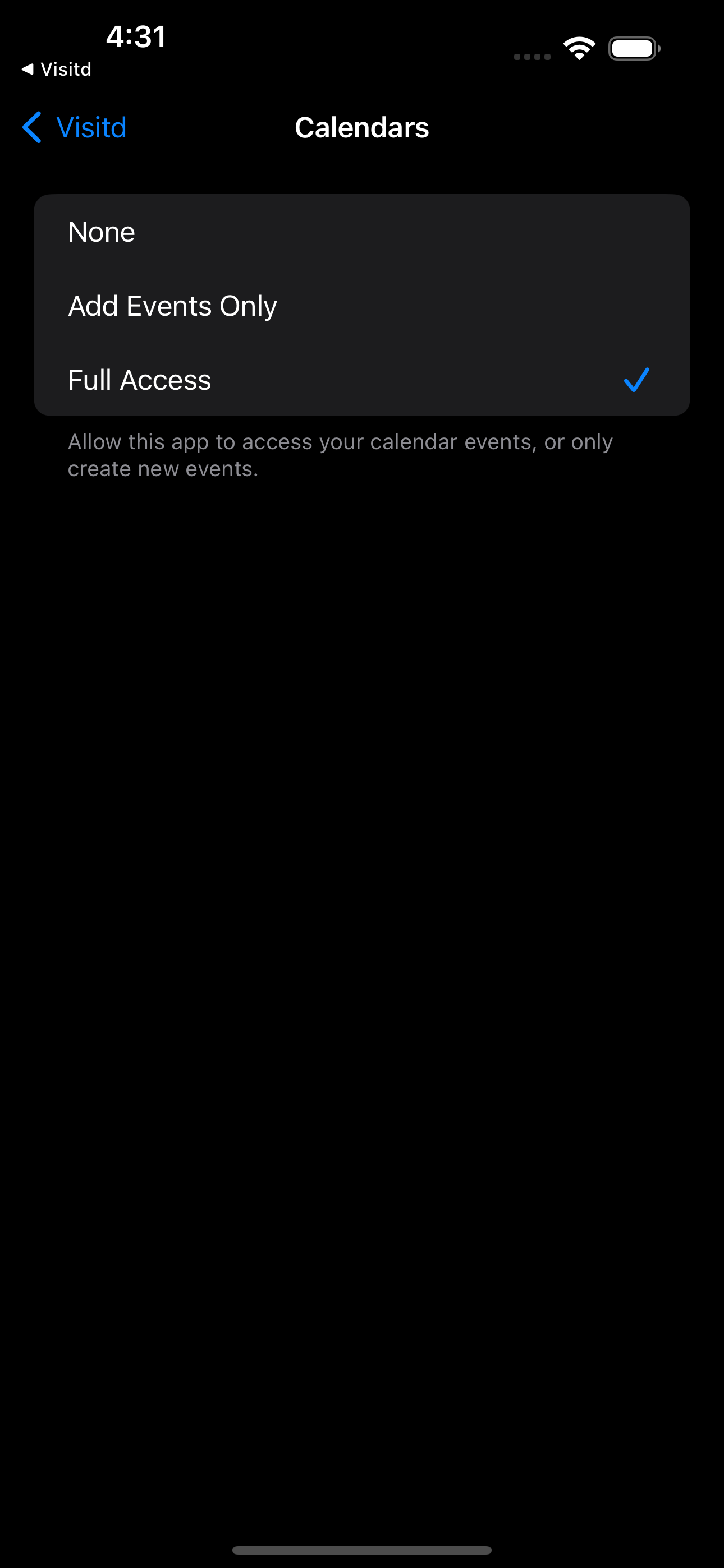 Clicking on Calendars will allow you to set the level of access Visitd has to your calendars. Calendar access should be Full Access.