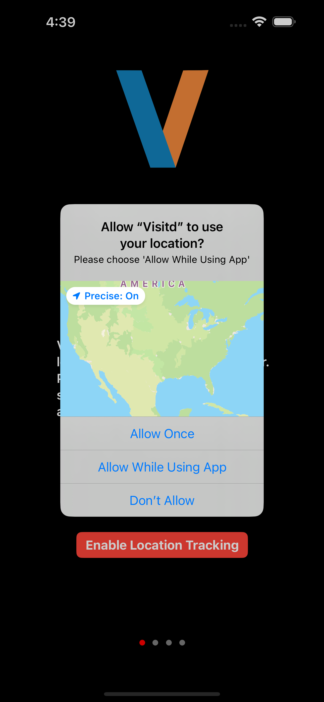Visitd needs your permission to track your location. Apple does not allow apps to request background location tracking immediately, an app must first request When In Use location tracking. The user will be prompted later to enable background location tracking.