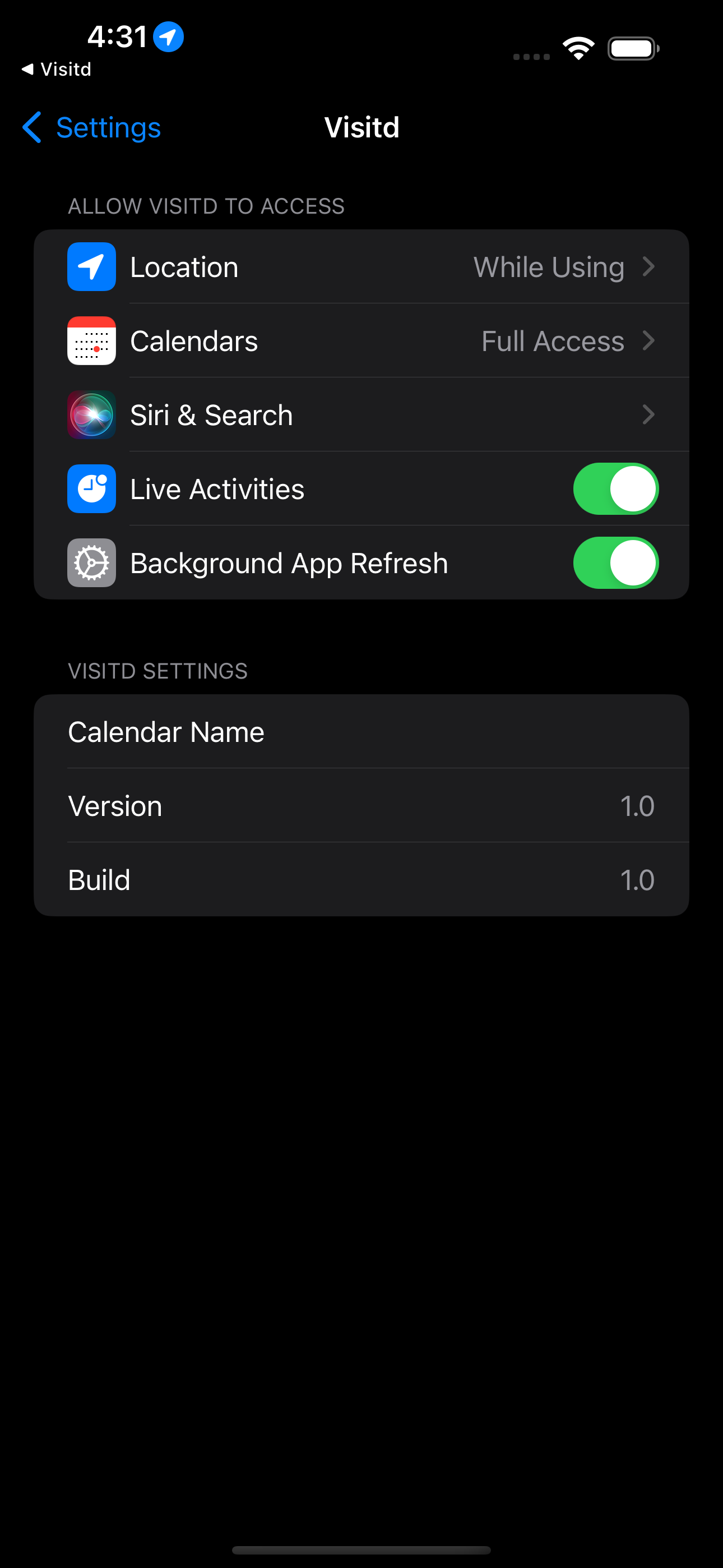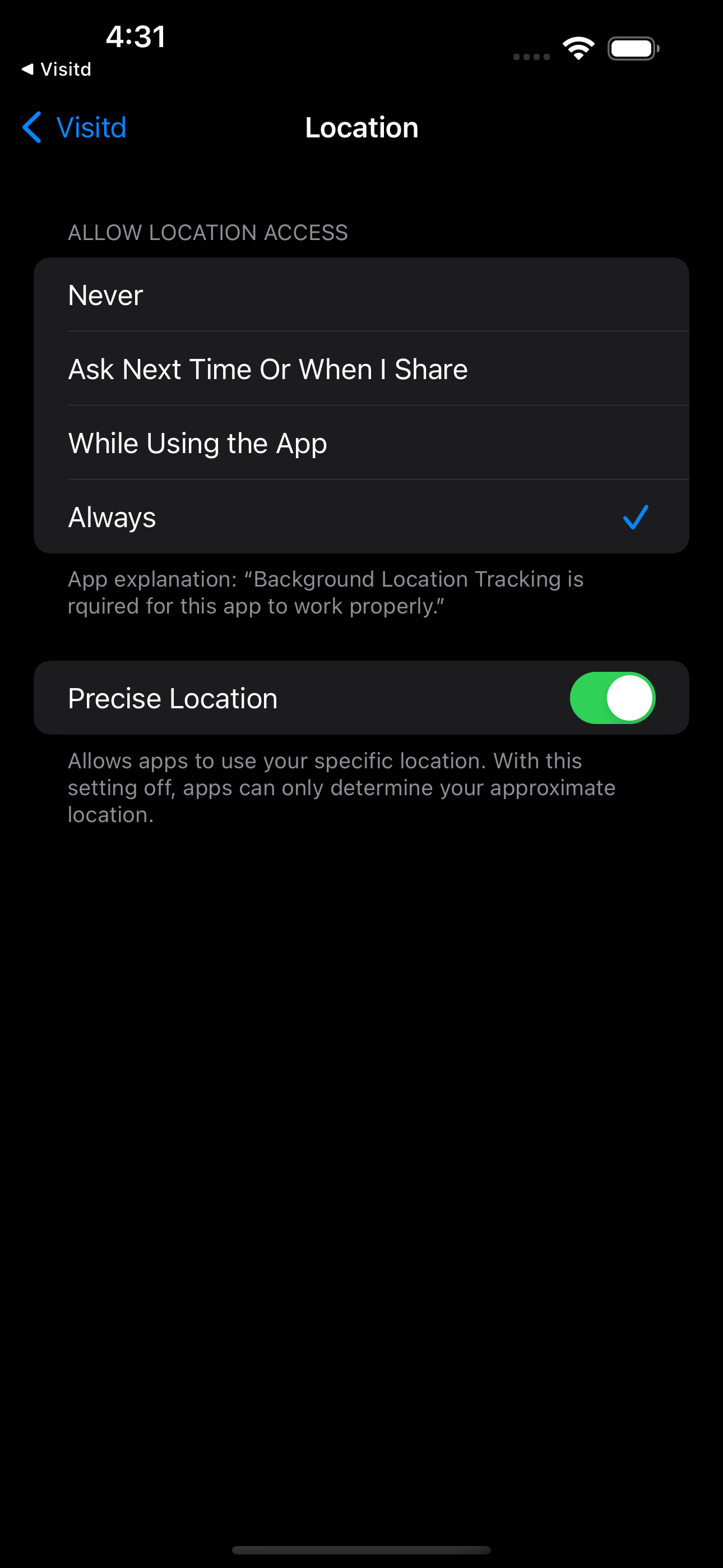 Clicking on Location will allow you to set the level of access Visitd has to location. The Location must be set to 'Always' for Visitd to function properly.